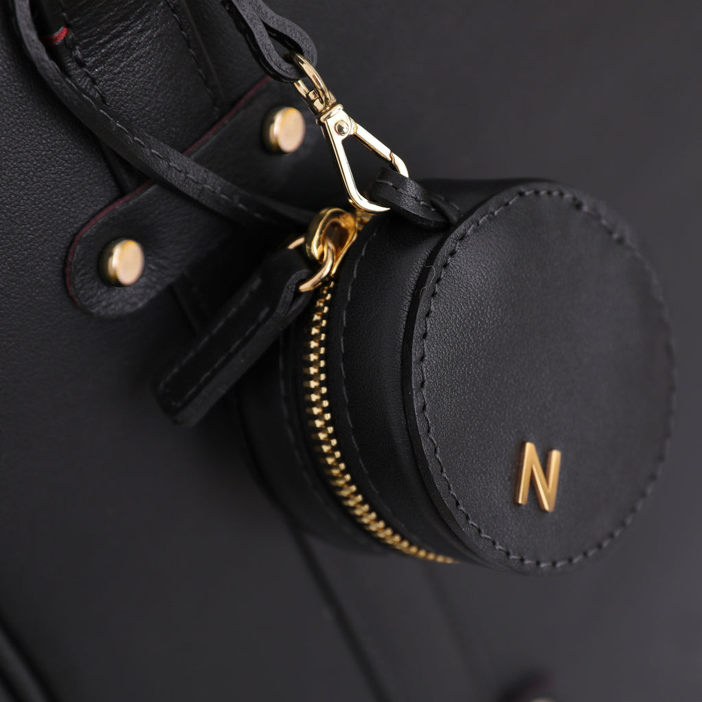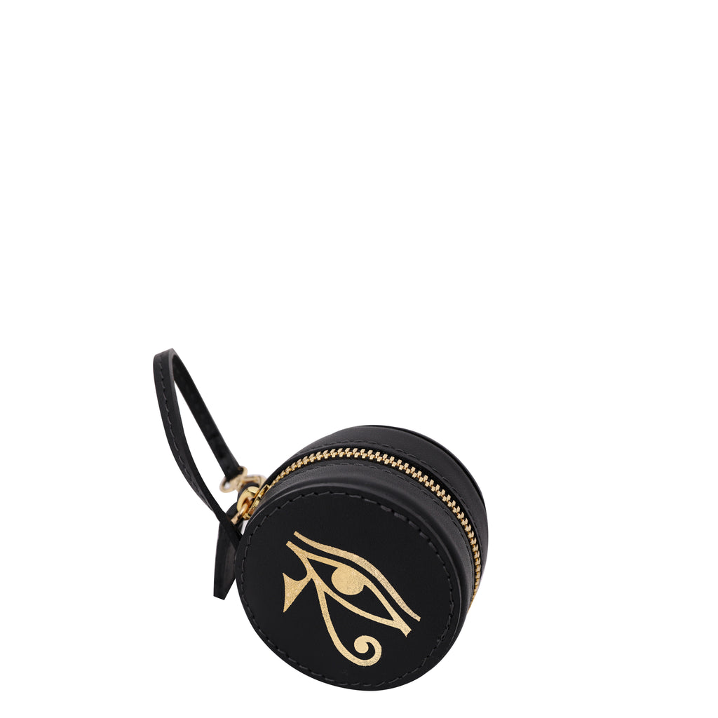 The round shape case from ARMOUR collection has been inspired by the ancient talismans which were meant to protect humans against superior forces. This powerful symbol of healing and protection Eye of Horus was embossed on the case. It can be worn either alone or combined with other bags attached by the swivel or just slipped to larger tote. Make this all seeing eye bag your personal protection amulet.