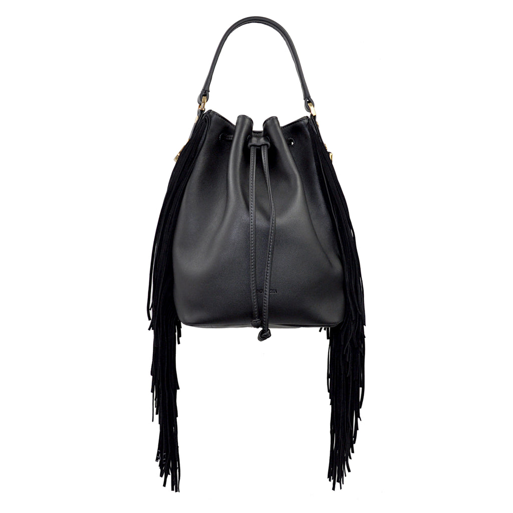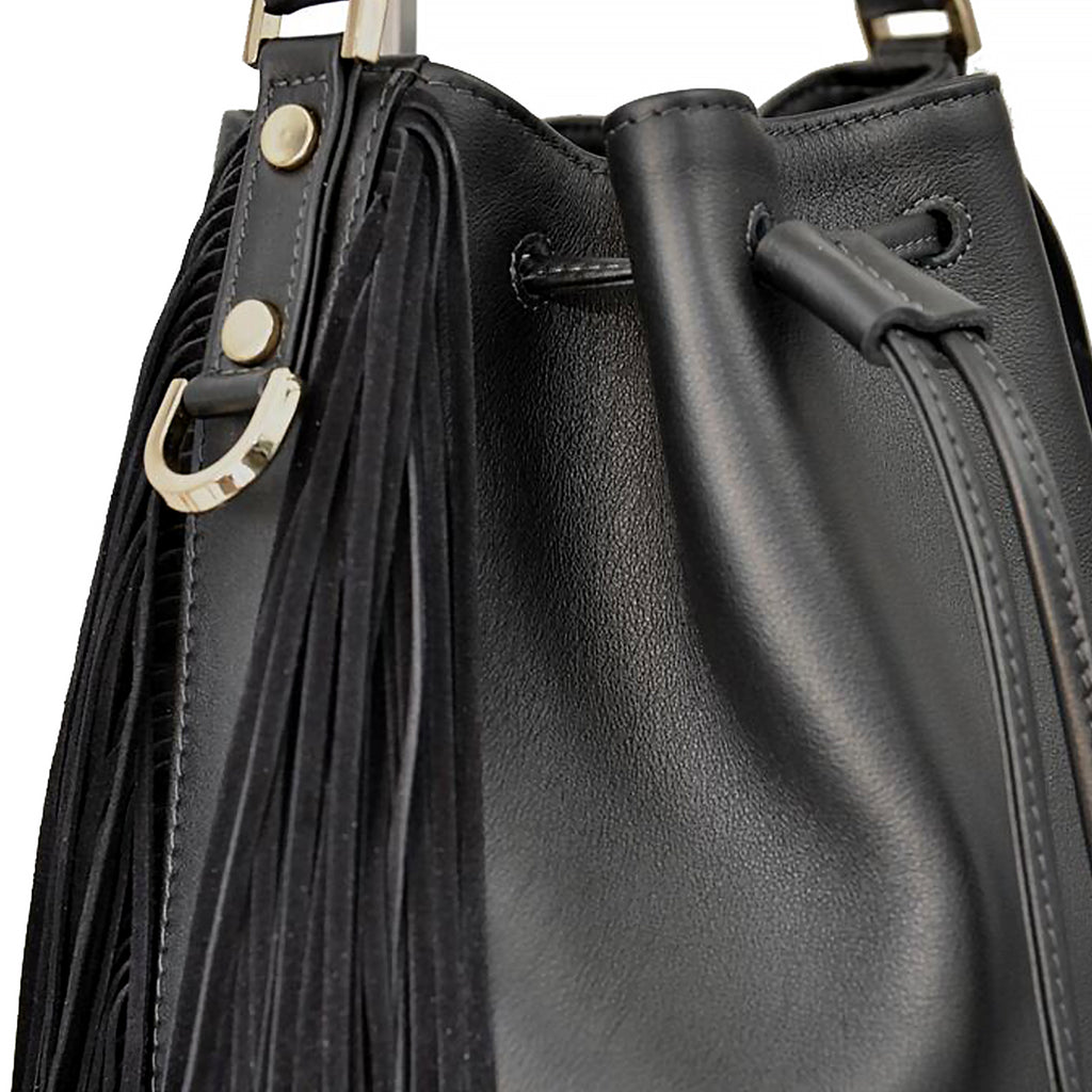 Our signature medium size bucket bag with side fringes made from suede leather in black color. What makes our fringes special? They are handmade from 2 layers of leather so that they get dramatic look and artisanal feel. Made form silky smooth leather and mixed with suede fringes, it is a year-round bag perfect for every season. It is sized to carry all your essentials and can be held by the handle or cross-body strap. Detailed with signature handle double stitching and decorated with gold hardware.