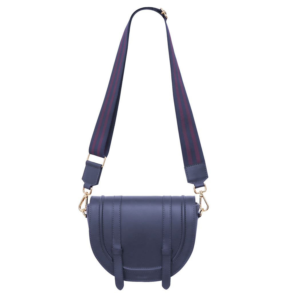 Our iconic half moon shape with signature ornaments characteristic for ARMOUR collection. It is crafted from smooth leather in luxurious denim color. Comes with two tone canvas strap in navy and burgundy color. This woven tape was made in Italy and it has both smart casual and chic look. Trimmed with leather and adorned with lux golden hardware.