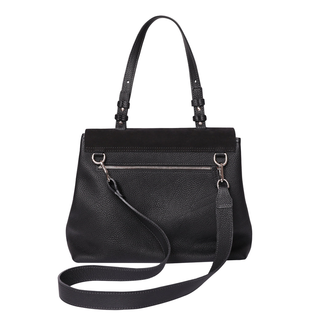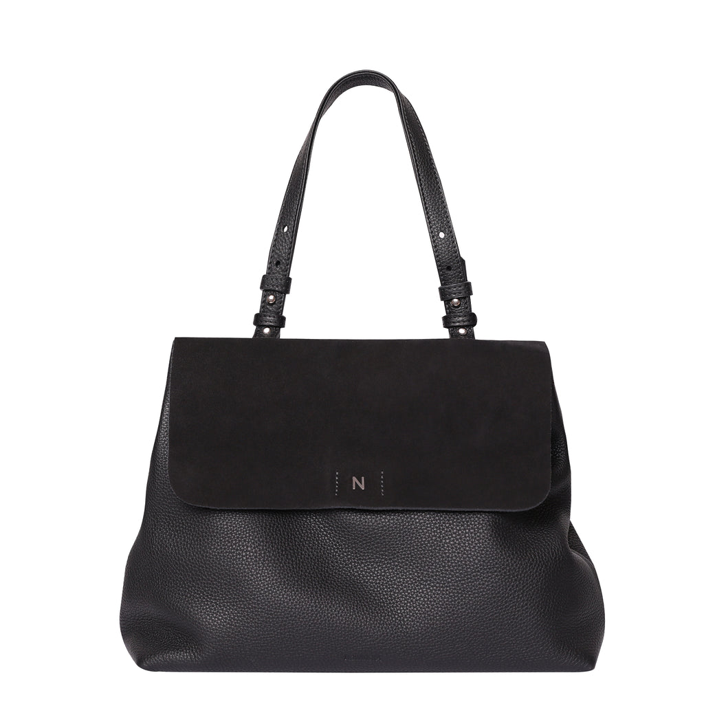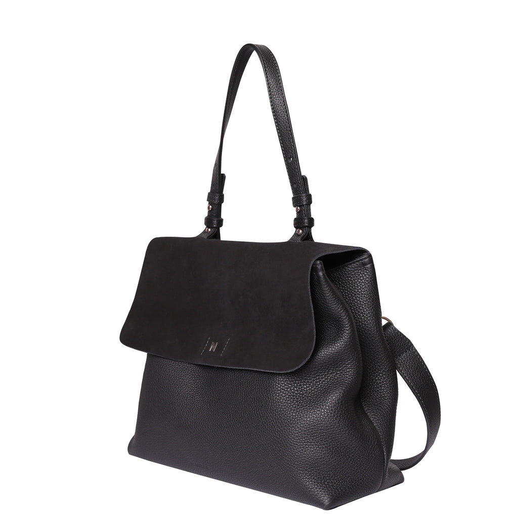 Our bestselling flap bag. Chic and versatile. Made from the combination of textured and suede leather. This soft feel bag is structured and well-organised. Wear it on your shoulder by the the short handle or crossbody by the long strap. Hand-stitched details and raw finishing front flap. Store your precious things safe in this bag secured by the zipper closure and the flap closed by a magnetic fastening.