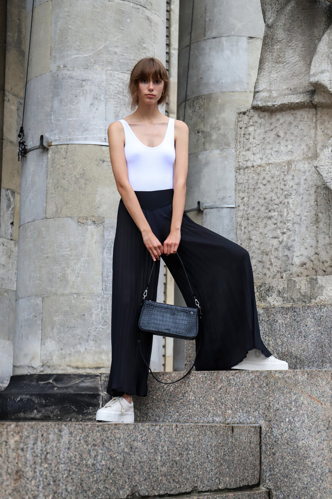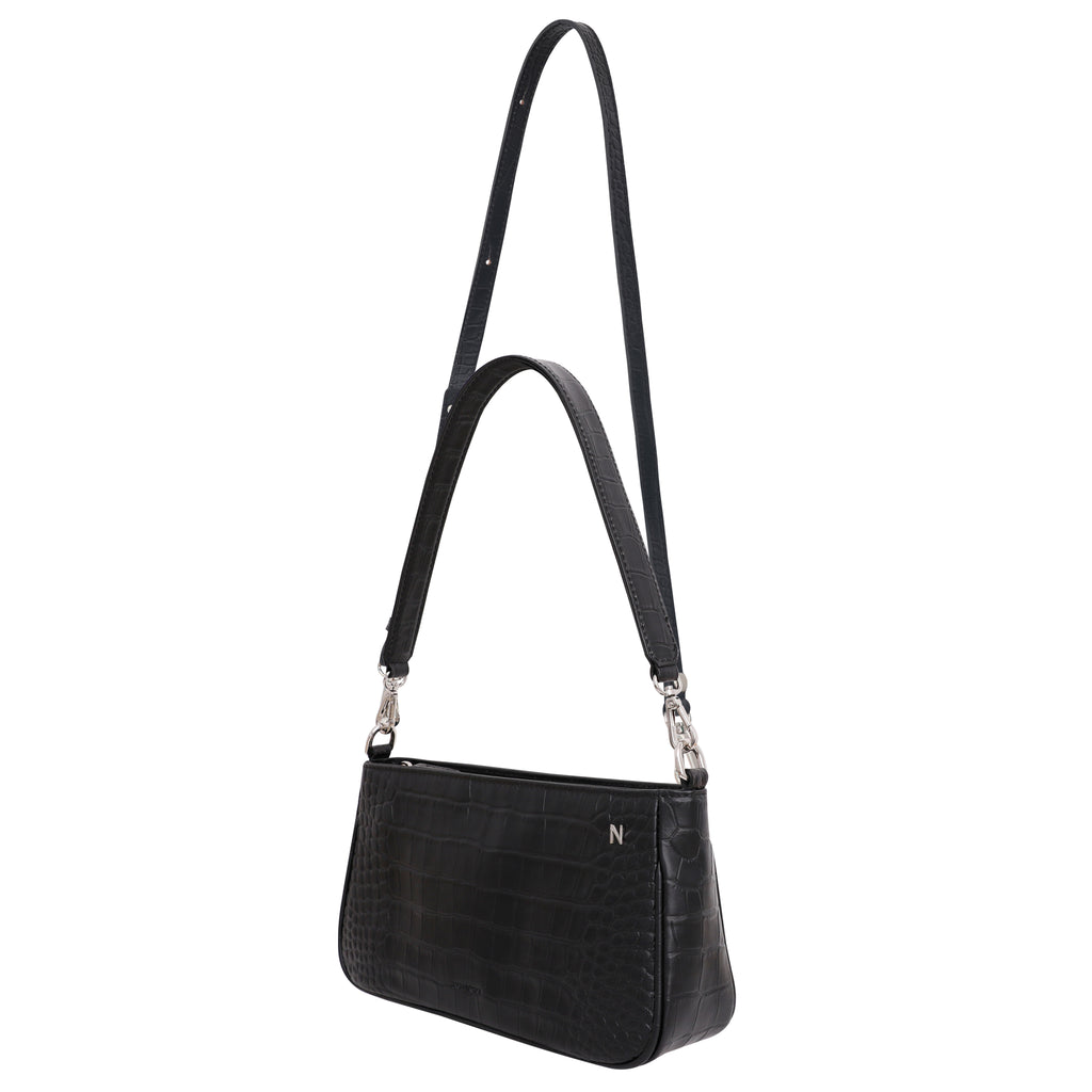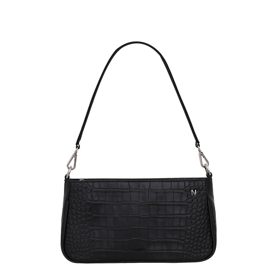 This stylish handbag was inspired by the iconic baguette styles of the '90s. Crafted from matt crocodile-embossed leather, this chic accessory boasts a sleek silhouette that effortlessly complements a variety of outfits. The shoulder strap ensures convenience without sacrificing style, while an additional cross-body strap provides versatile wear options. Elevate your fashion game with this on-trend and functional bag.
