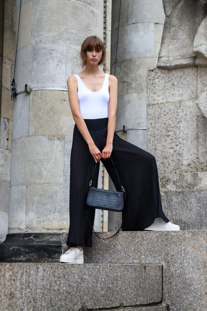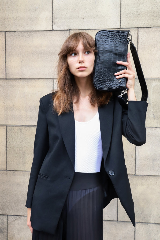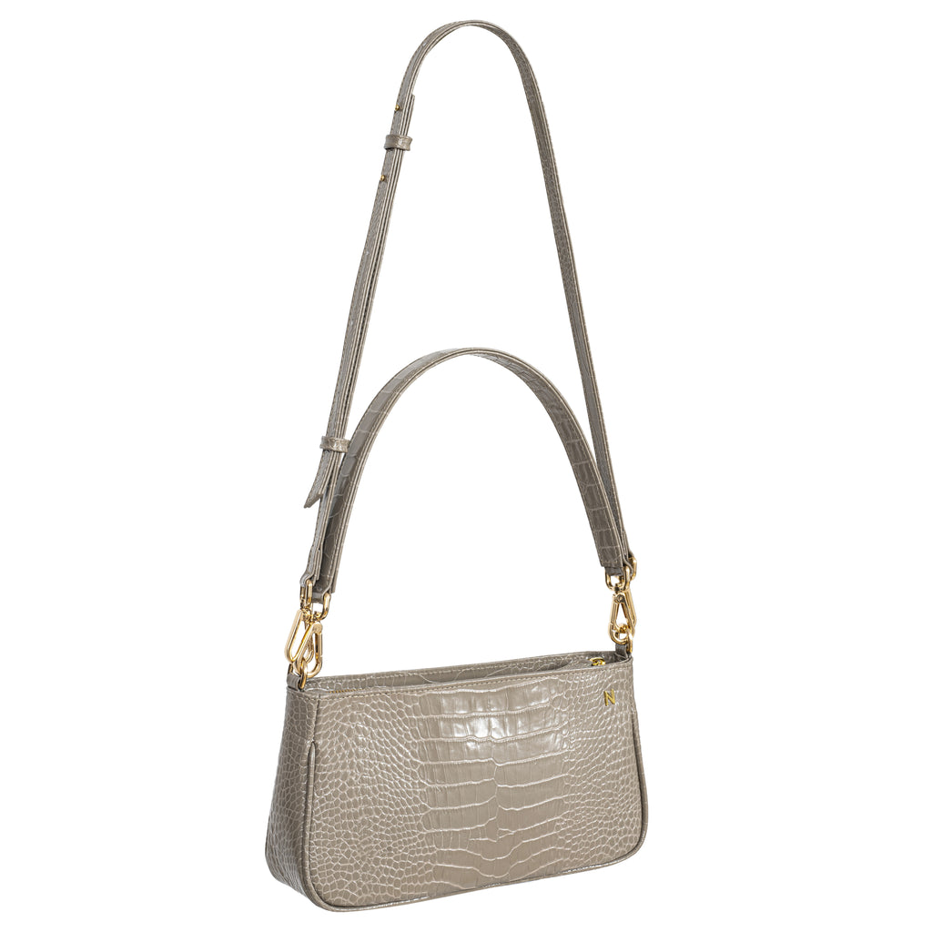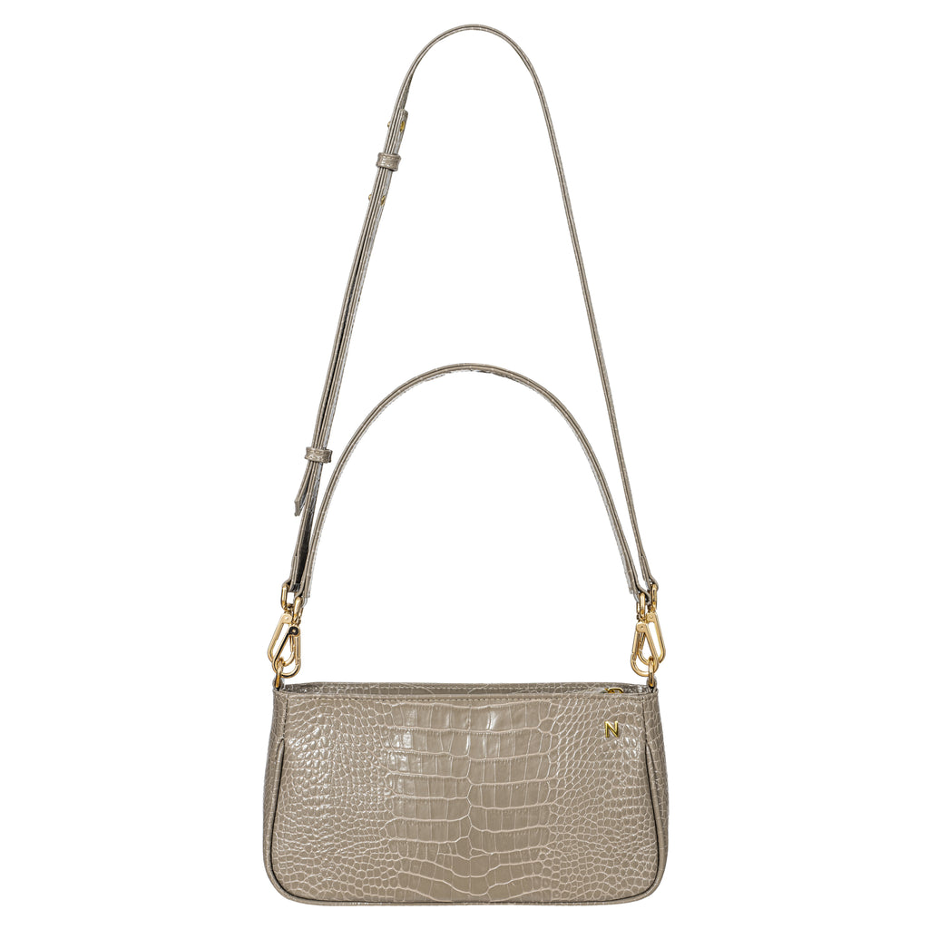 This stylish handbag was inspired by the iconic baguette styles of the '90s. Crafted from glossy crocodile-embossed leather, this chic accessory boasts a sleek silhouette that effortlessly complements a variety of outfits. The discreet slim strap ensures convenience without sacrificing style, while an additional cross-body strap provides versatile wear options. Elevate your fashion game with this on-trend and functional bag.