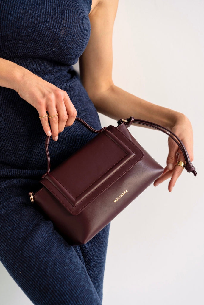 Elevate your closet with this versatile handbag and experience the perfect blend of fashion and function. Crafted from the finest smooth leather in a rich burgundy hue, this small bag is designed to be soft yet structured, offering ample space despite its compact size. The wide, structured bottom enhances practicality without compromising style. Carry it by the top handle or cross-body for maximum comfort. The detachable leather strap allows for multiple styling options, while a decorative leather cord doubles as a wrist strap. Spacious enough to fit a large wallet, glasses case and all your essentials, it's perfect for both everyday use and formal occasions.
