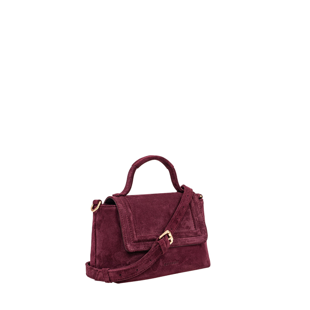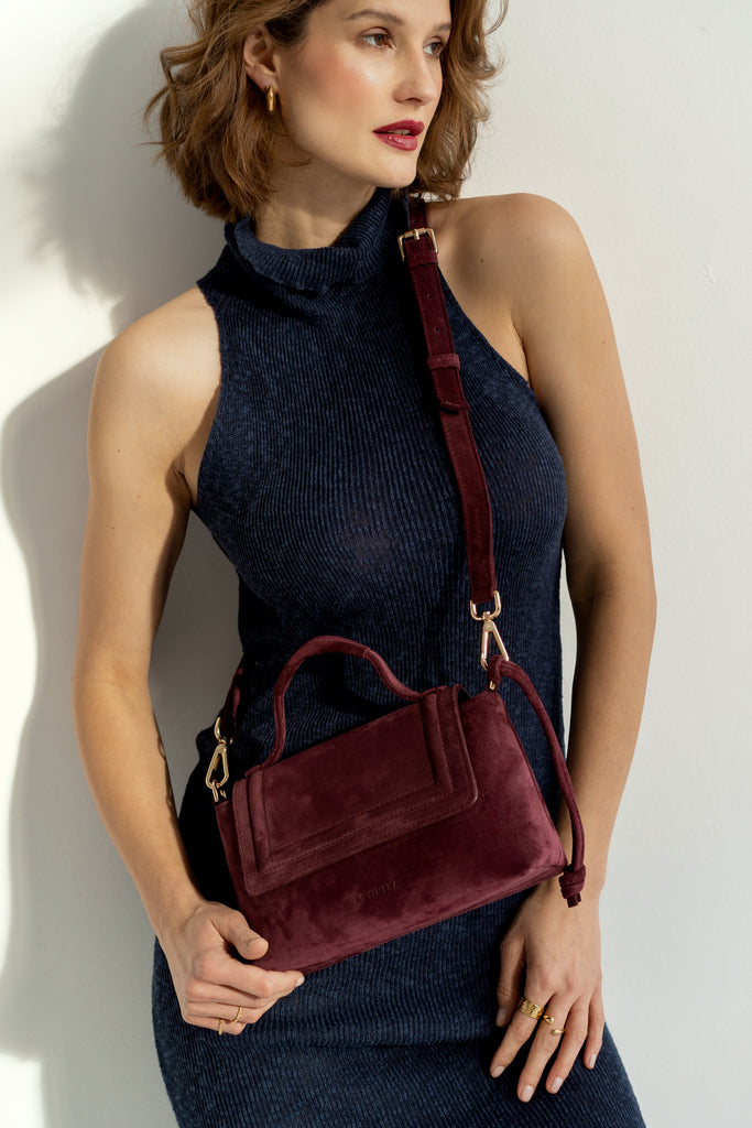 Elevate your closet with this versatile handbag and experience the perfect blend of fashion and function. Crafted from the finest Italian suede leather in a rich burgundy hue, this small bag is designed to be soft yet structured, offering ample space despite its compact size. The wide, structured bottom enhances practicality without compromising style. Carry it by the top handle or cross-body for maximum comfort. The detachable leather strap allows for multiple styling options, while a decorative leather cord doubles as a wrist strap. Spacious enough to fit a large wallet, glasses case and all your essentials, it's perfect for both everyday use and formal occasions.