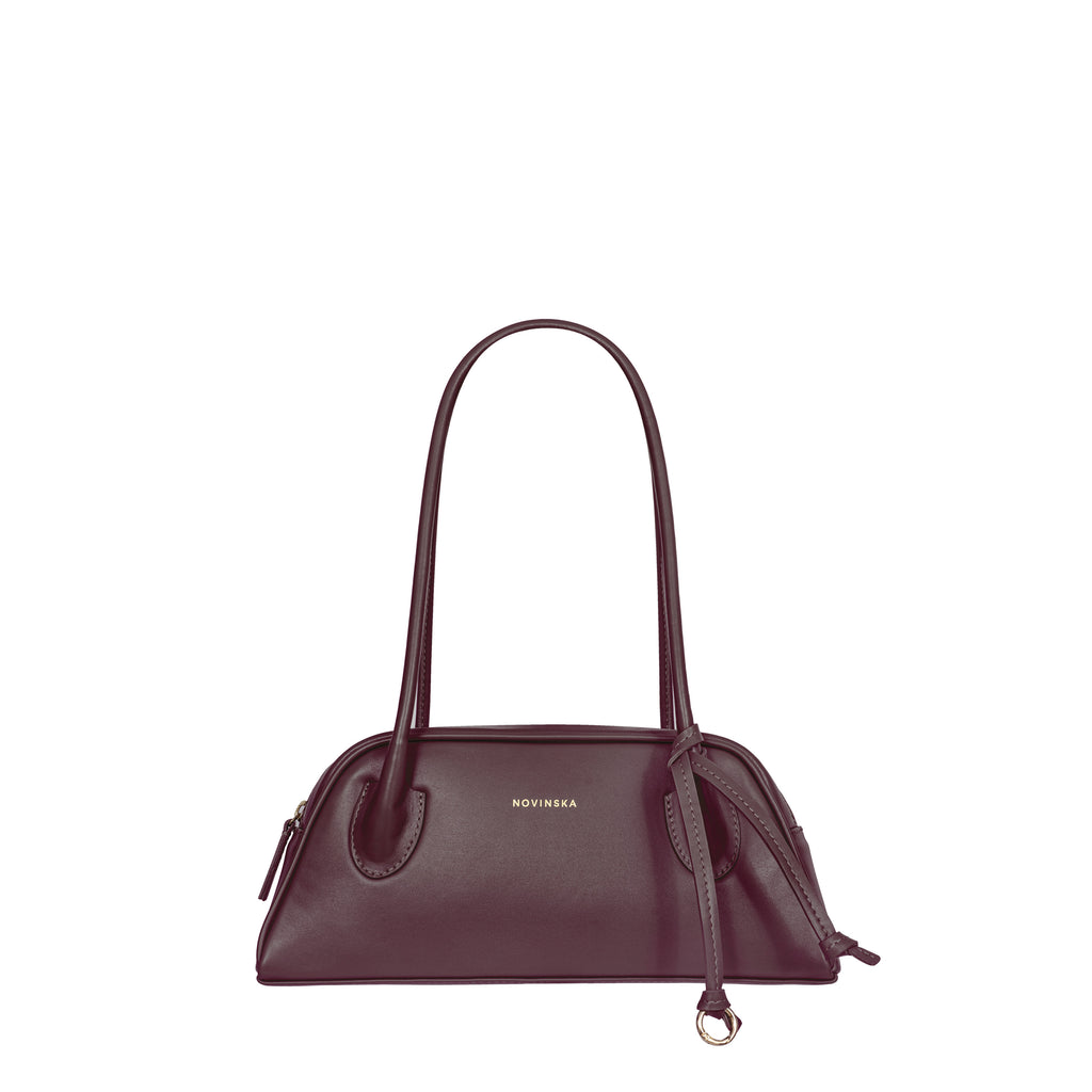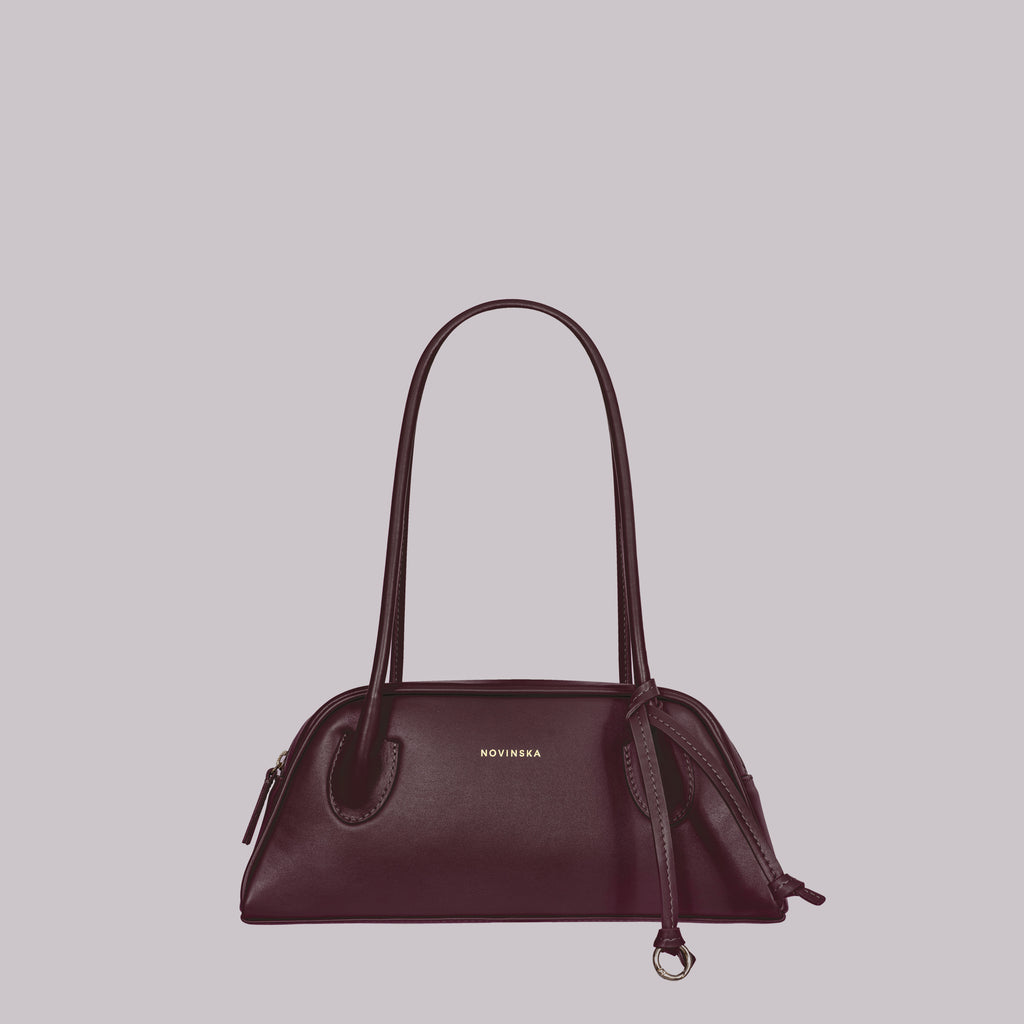 The trapeze handbag, inspired by ’90s silhouettes, seamlessly blends the latest trends with timeless elegance. Crafted from Italian smooth leather in wine color, it embodies a simple yet refined style with a flawless finish. The long, comfortable shoulder handles are meticulously crafted using the finest techniques, ensuring both ease and a unique character. The bag features a zip closure and opens wide for easy access to the interior. A subtle yet striking detail is the decorative leather cord finished with a ring.