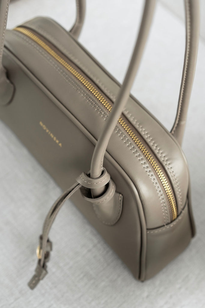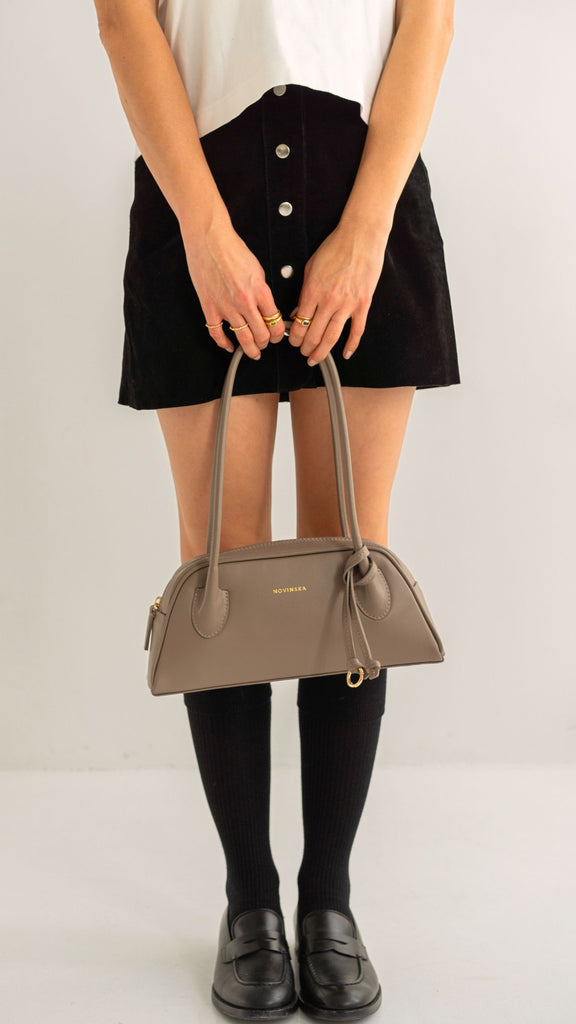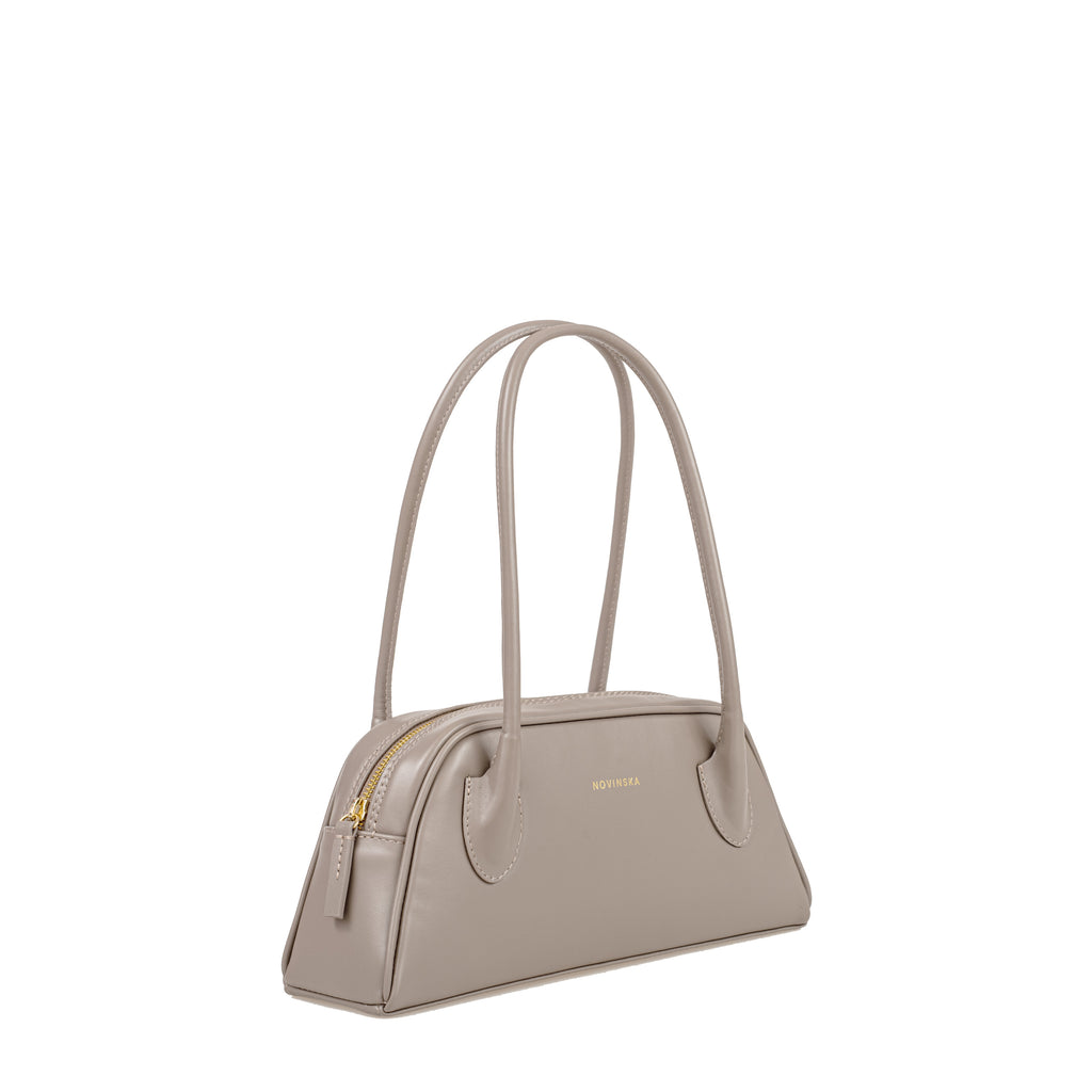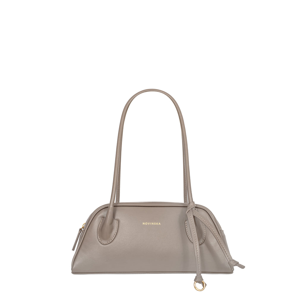 The trapeze handbag, inspired by ’90s silhouettes, seamlessly blends the latest trends with timeless elegance. Crafted from smooth taupe leather, it embodies a simple yet refined style with a flawless finish. The long, comfortable shoulder handles are meticulously crafted using the finest techniques, ensuring both ease and a unique character. The bag features a zip closure and opens wide for easy access to the interior. A subtle yet striking detail is the decorative leather cord finished with a ring.
