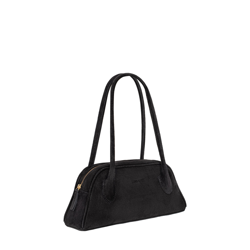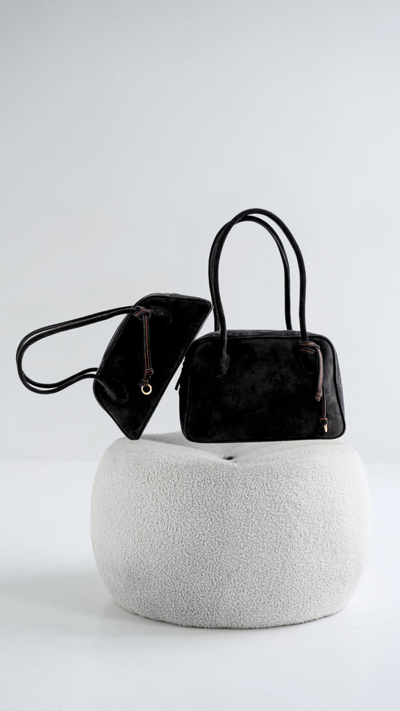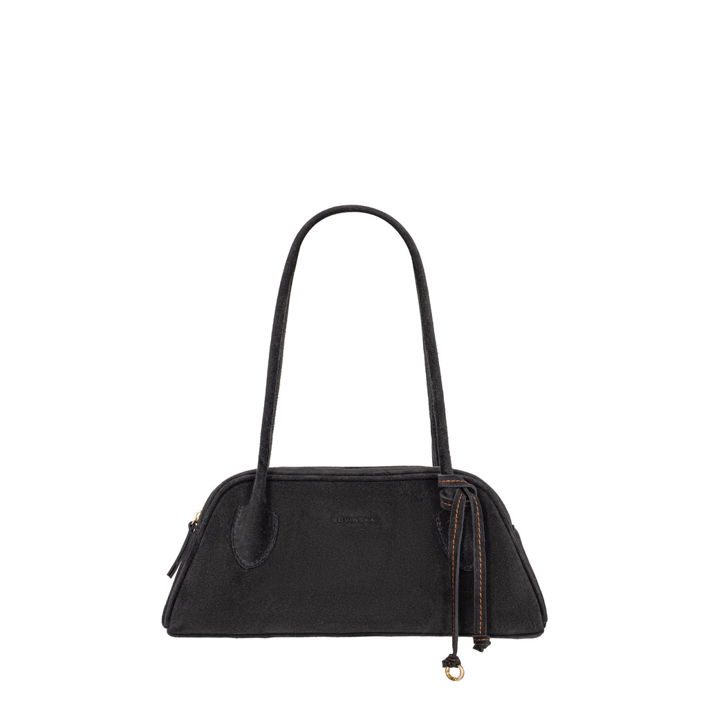 The trapeze handbag, inspired by ’90s silhouettes, seamlessly blends the latest trends with timeless elegance. Crafted from Italian suede leather in deep black hue, it embodies a simple yet refined style with a flawless finish. The long, comfortable shoulder handles are meticulously crafted using the finest techniques, ensuring both ease and a unique character. The bag features a zip closure and opens wide for easy access to the interior. A subtle yet striking detail is the decorative leather cord finished with a ring.