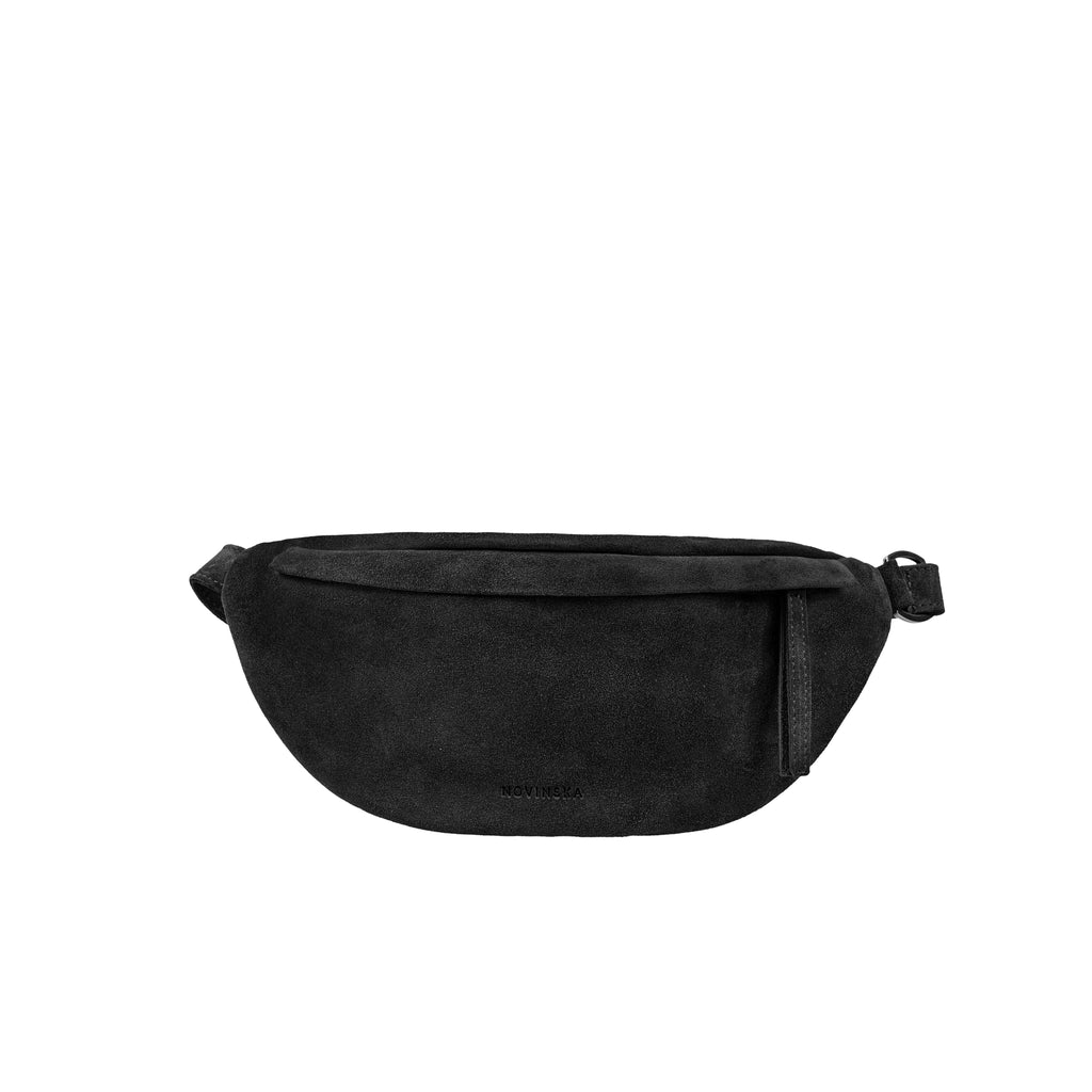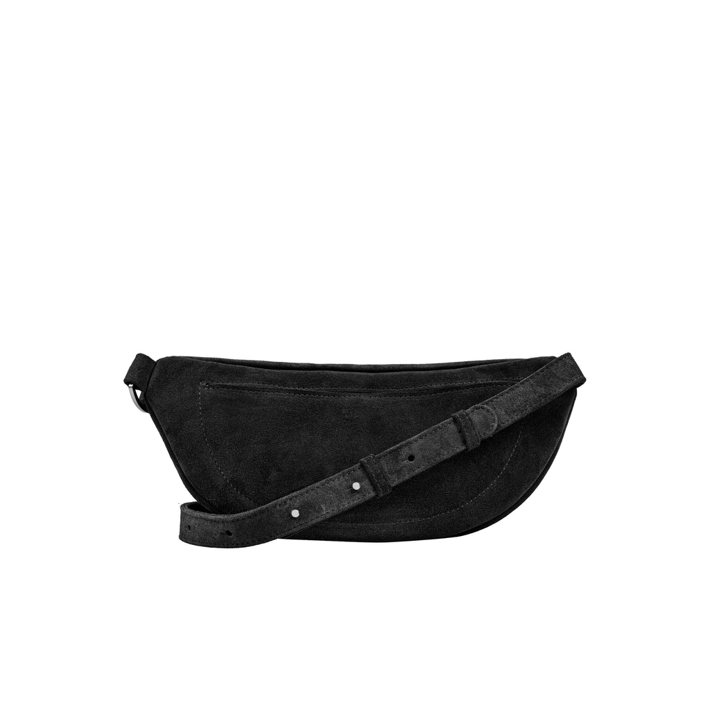 The bag is secured with a zipper in matching color, and the zipper pull is accented with our signature contrasting stitching. The metal elements with their unique shape add an edgy touch to the design. The luxurious suede leather in black color is timeless and seasonless.