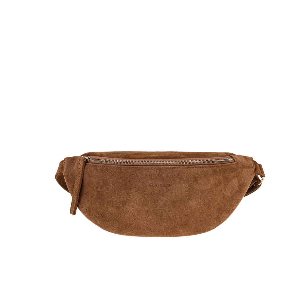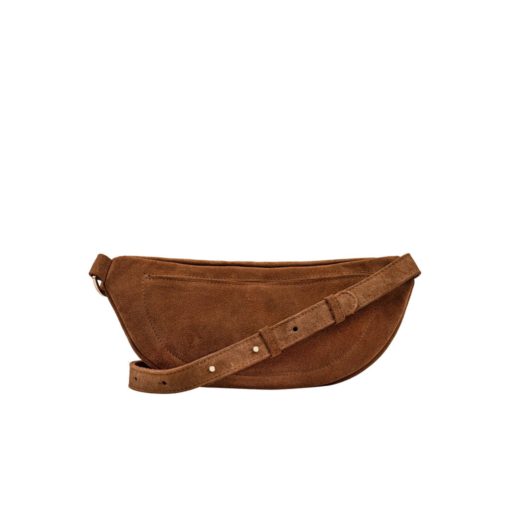 The bag is secured with a zipper in matching color, and the zipper pull is accented with our signature contrasting stitching. The metal elements with their unique shape add an edgy touch to the design. The luxurious suede leather in cognac color is timeless and seasonless.