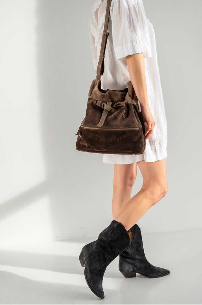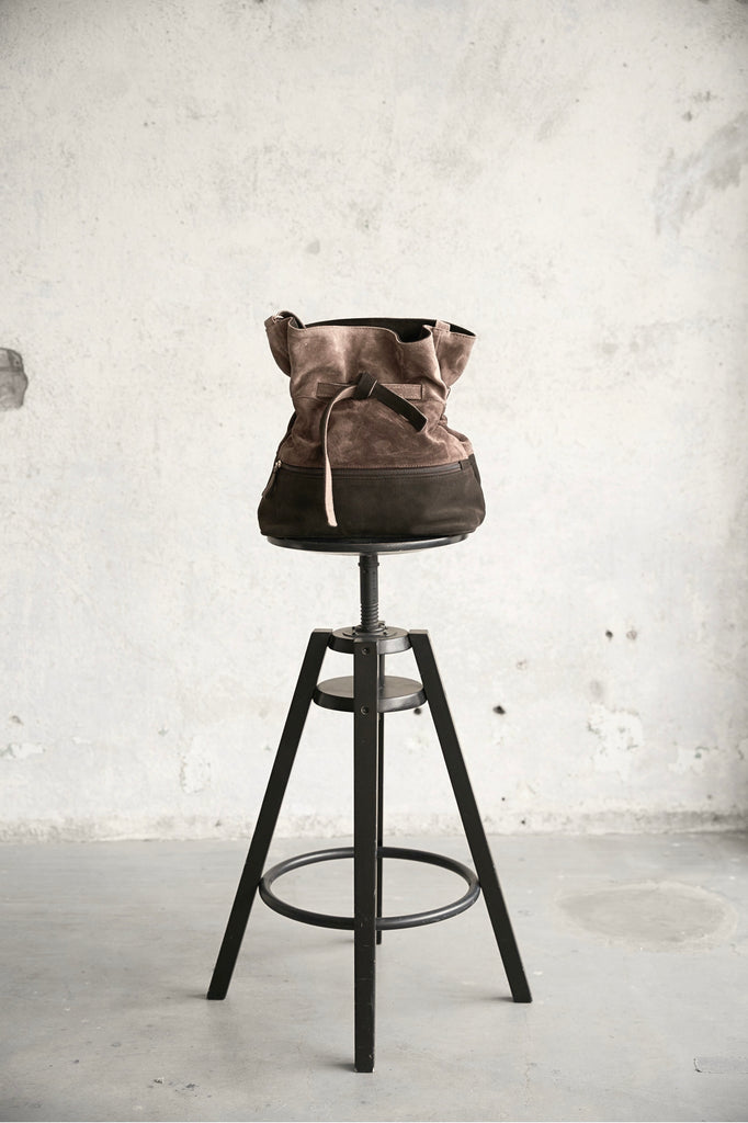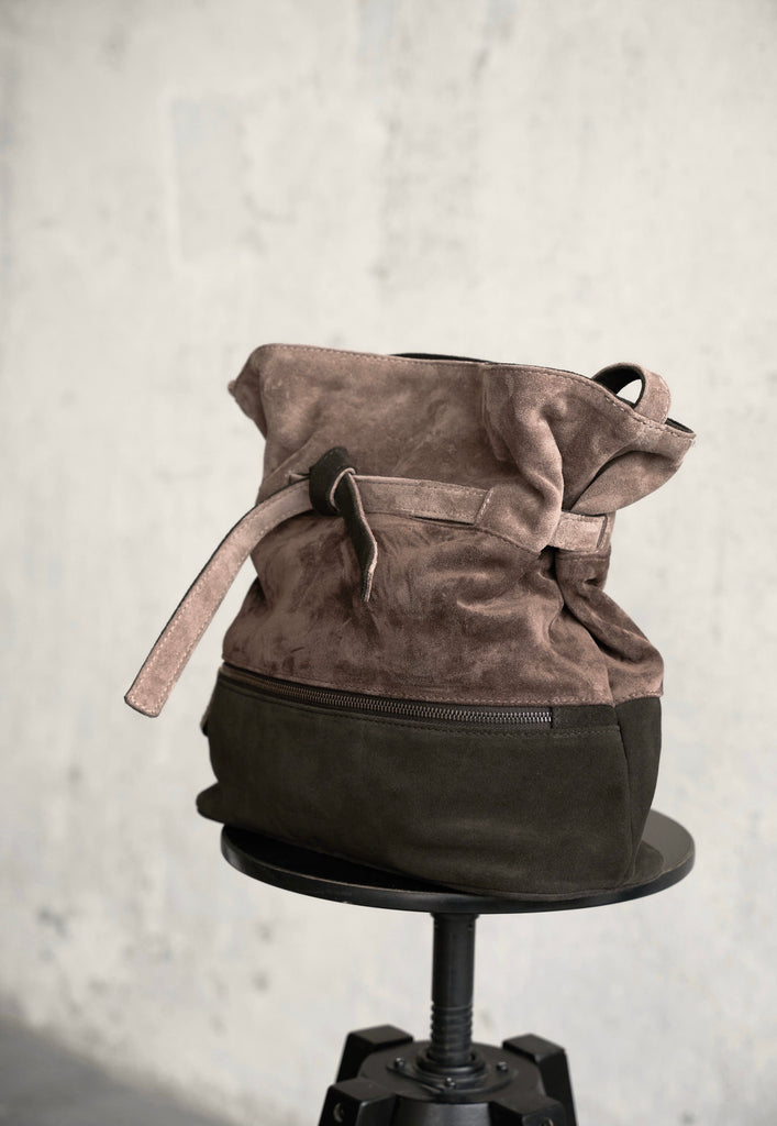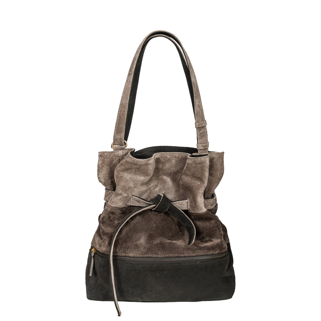A luxurious suede bucket bag in stunning shades of stone brown, crafted from three leather panels in earthy tones for a sophisticated and timeless look. The soft, foldable collar reveals a contrasting interior finish when turned down, adding an extra layer of elegance. Two-tone straps add distinctive character, with a long, adjustable strap that can be shortened in a single motion for comfortable, under-the-arm wear.