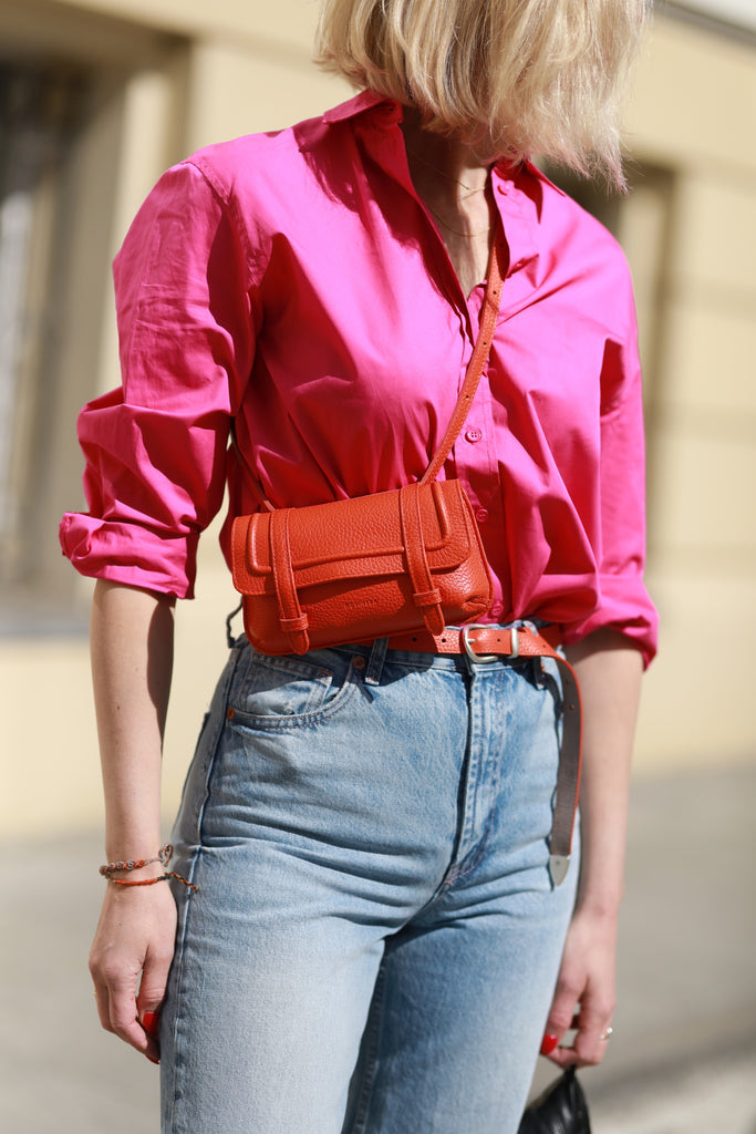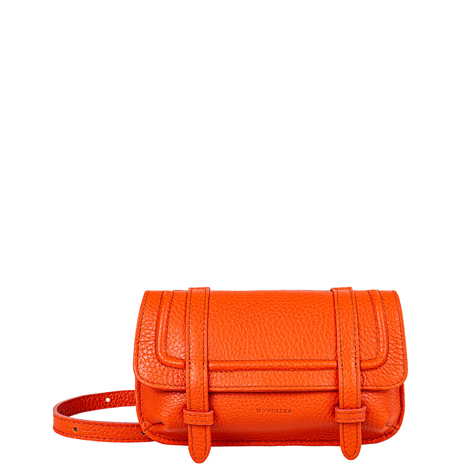 The No.108 mini bag in a vibrant orange is designed for versatility, offering two stylish options: wear it around your waist or cross-body with the detachable strap. NOVINSKA handbags are crafted with attention to even the smallest details, following sustainable and thoughtful practices. The flap features their signature ornament, and the leather is cut using zero-waste principles. Made from pebbled leather, this bag is the perfect accessory to elevate simple white shirts or slouchy t-shirts, adding a playful pop of color to any outfit.